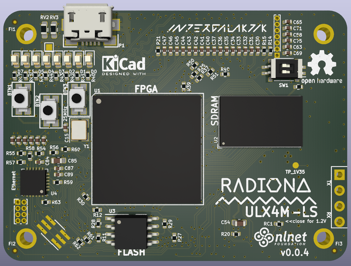 The idea is to split the circuit board into two parts, the FPGA with memory, and a mass-produced base board. The base boards can be a Raspberry Pi 4 compute module base board such as the TOFU, or you can build an application specific base board for your needs. The initial base board reproduced the functionality of the ULX3S.