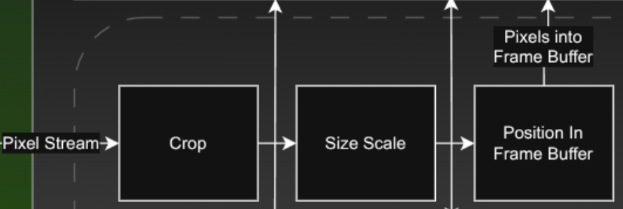 A pixel stream from something like an OV2640 camera digital video port DVP is cropped to a selected area of the image, scaled up by an integer factor, and finally positioned somewhere in the output frame buffer.
